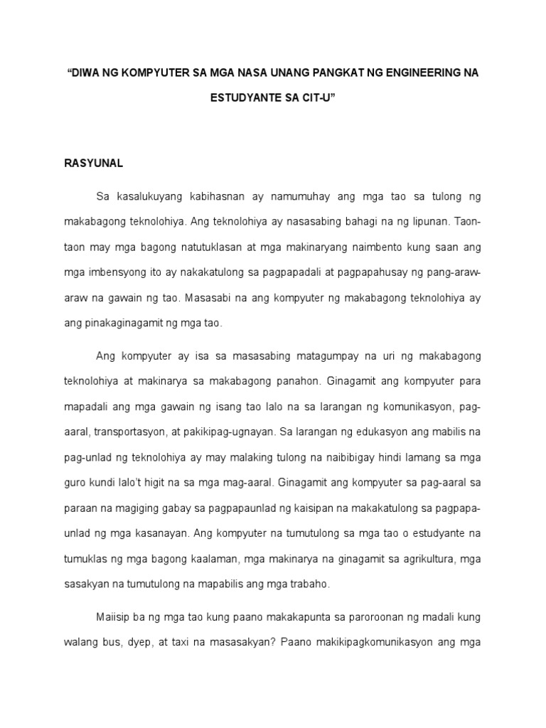 - Sa mga respondente sa paglaan ng panahon upang matapat na sagutan ang aming inihandang kwestyuner - Sa aming kanya-kanyang pamilya sa pag-unawa at pagpapahintulot sa aming umuwe sa oras na hindi namin kinagawian matapos lamang ang pamanahong-papel at higit sa lahat - Sa Poong Maykapal sa pagdinig sa mga panalangin lalong-lalo na sa sandaling kami ay pinanghihinaan na ng loob at wala ng. Since its emergence teknolohiy up until the 21st century Catholicism has played an important role in the ascription of human societal norms beliefs and practices in accordance to sex and gender. Ang malaking epekto nito sa mga mag-aaral.