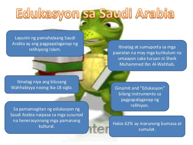 Edukasyon sa Saudi Arabia Ang bansang Saudi Arabia ay nagbibigay. Anu-ano ang katangiang pisikal ng kanlurang asya. Tila nahuhuli kung minsan ang sistema ng edukasyon na mayroon ang timog silangang asya.