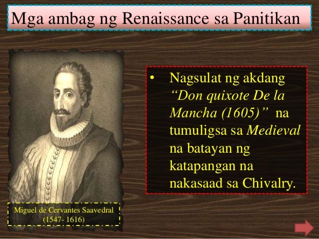 Miguel de Cervantes 1547 1616. 29112019 Ilan sa mga taong nanguna sa Renaissance at nagkaroon ng malaking ambag sa kabihasnan ay ang mga sumusunod. Ang Ama ng Humanismo.