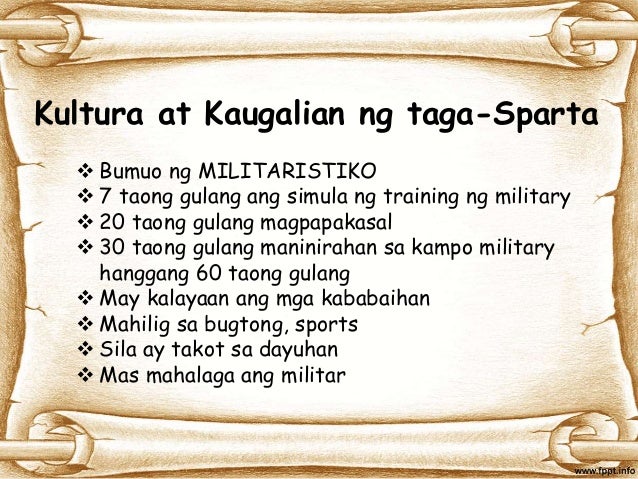 Naihahalintulad ang ugaling Athenians at Spartans sa sariling pamumuhay 3. Maliban dito ang pilosopikal na kontribusyon ng mga pangunahing pigura tulad ng Socrates Hippocrates ay hindi maaaring balewalain. Samantalang sinakop ng Sparta ang mga karatig na rehiyon nito.