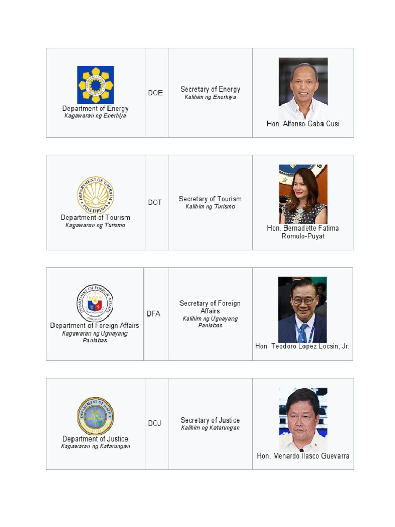 Sino sino ang mga namumuno sa mga departamento ng pamahalaan ng pilipinas. Asked by Wiki User. Si Gregorio Araneta ang kauna-unahang nailuklok bilang kalihim ng Kagawaran ng Pananalapi at Katarungan o sa wikang Ingles ay Department Finance and Justice.