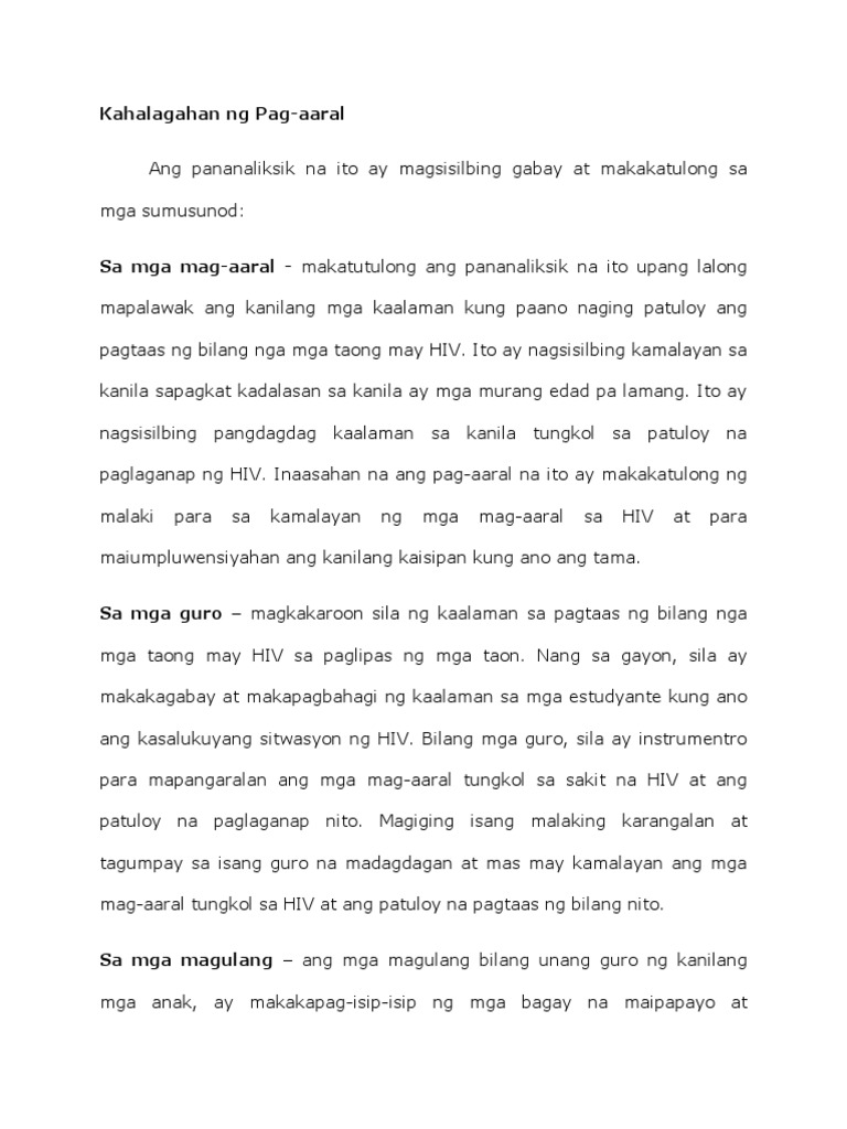 Kahalagahan ng pag-aaral Ang pananaliksik na ito ay inilahad ang kahalagahan ng akademikong pagganap sa mga mababangit na tao. 24Ang social media ay mga website at application na ginagamit ng malalaking grupo ng mga tao upang magbahagi ng impormasyon at upang bumuo ng mga social at propesyonal na mga contact. 09-12-2016 Ang mga desisyon ng ating mga pinuno hinggil sa kapakanang pambansa ay batay sa resulta ng pananaliksik na isinasagawa ng mga.